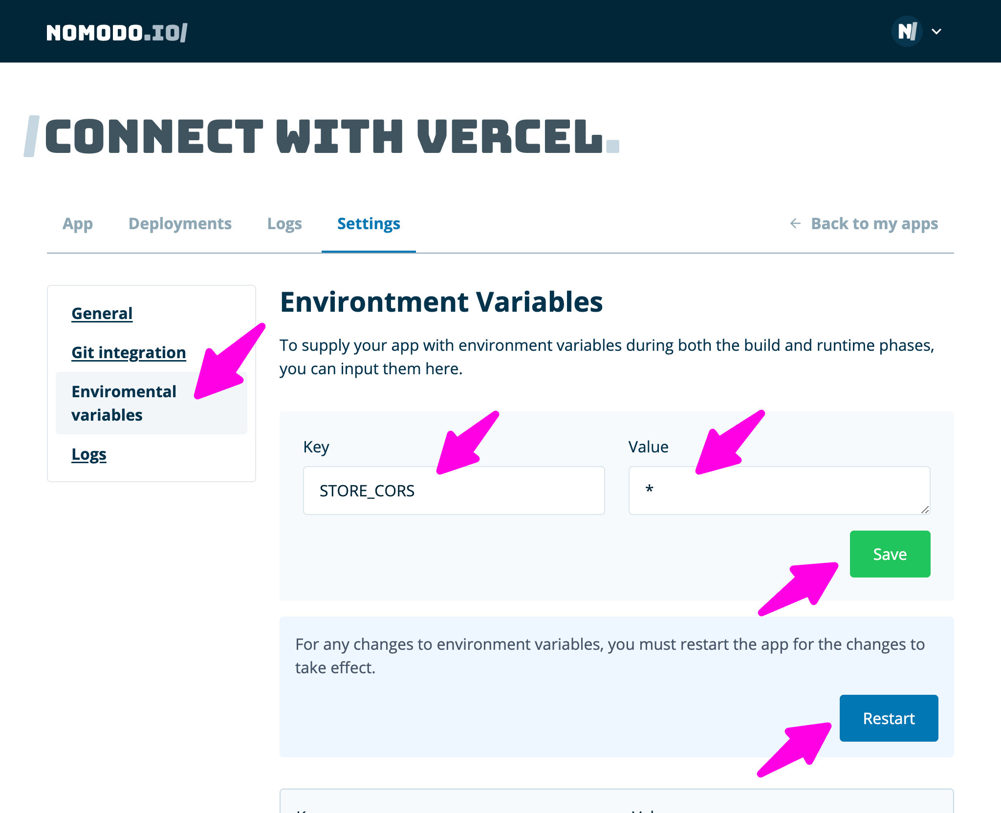 STORE_CORSand the Value with* - Save and Restart to apply settings
