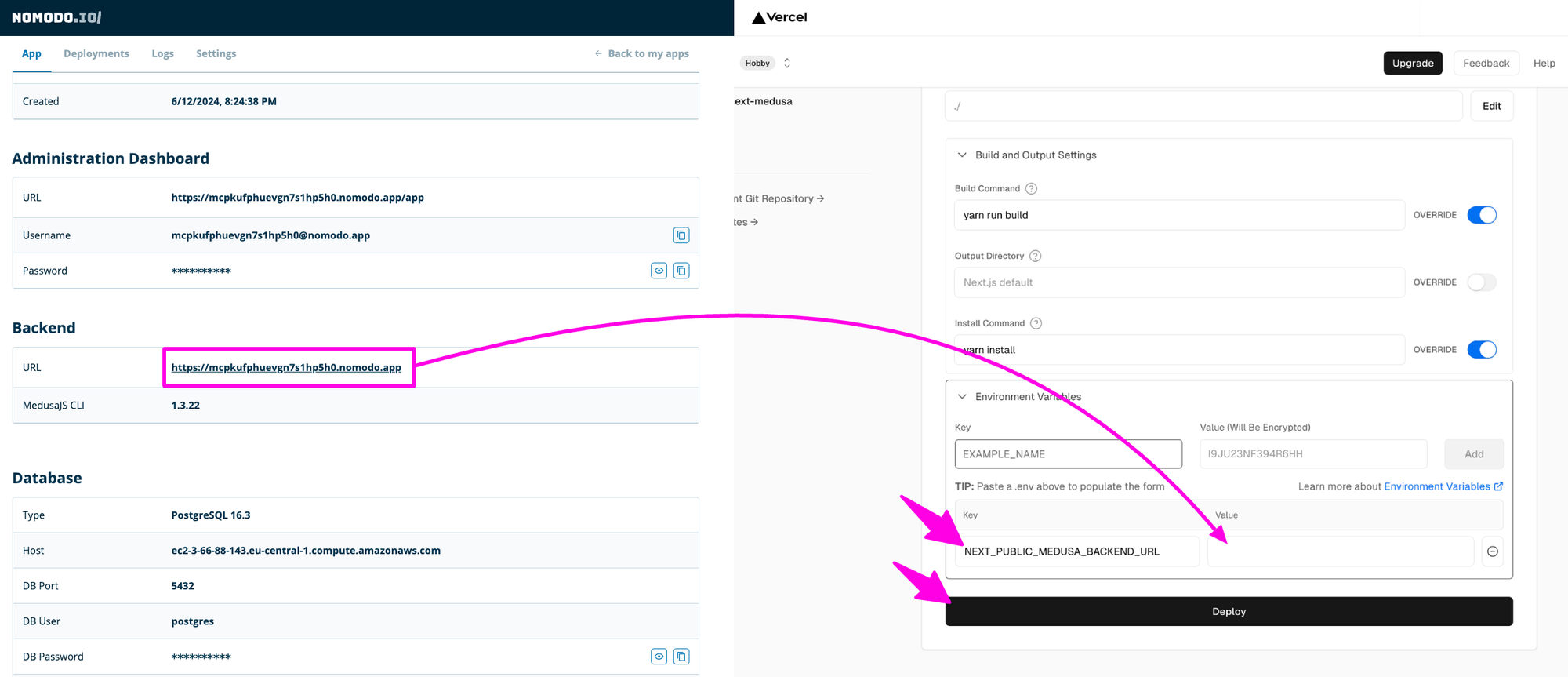 NEXT_PUBLIC_MEDUSA_BACKEND_URLand pasteBackend URLin the value field. - Deploy to apply settings