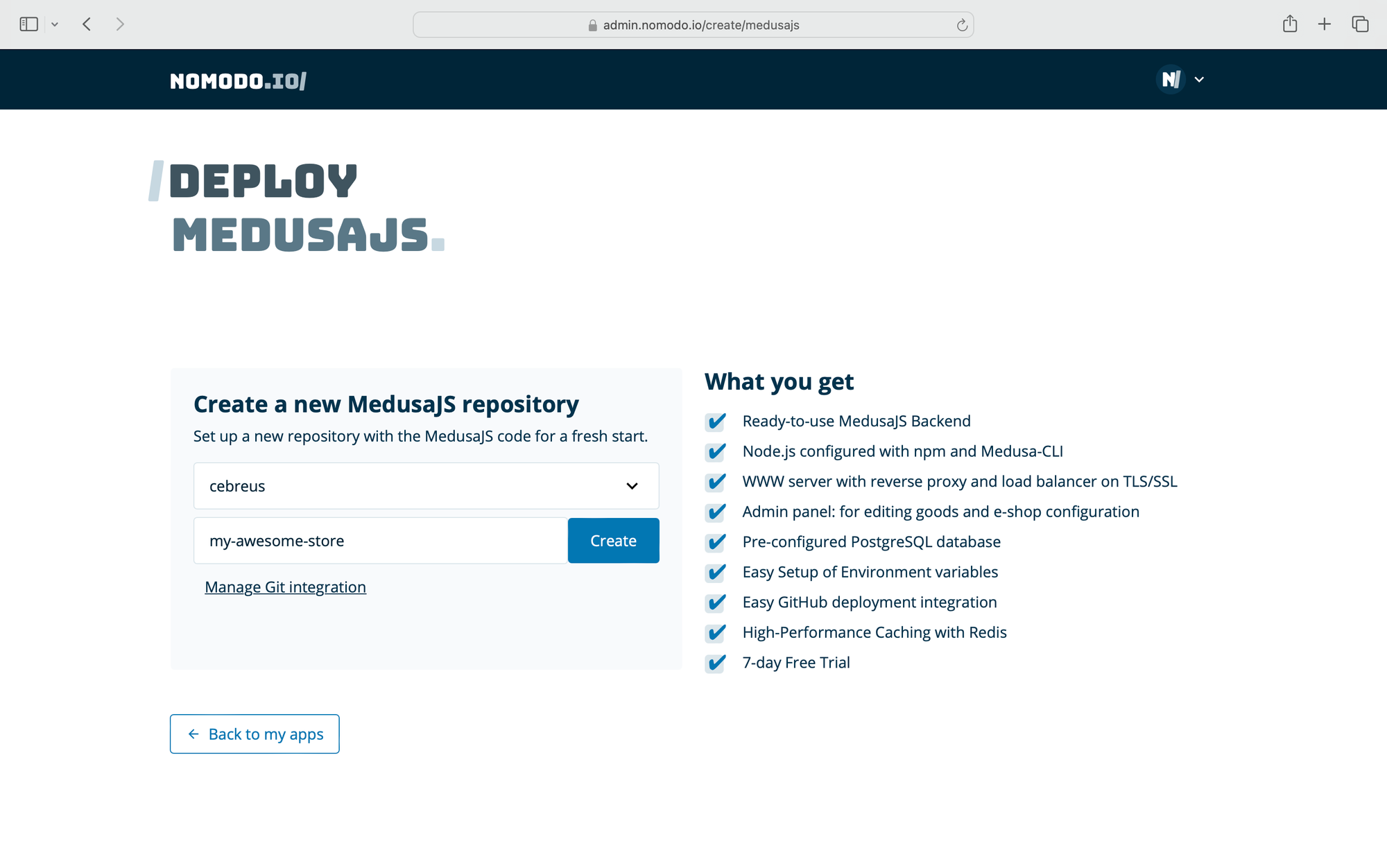 - In the Nomodo dashboard, click “Create new MedusaJS”.