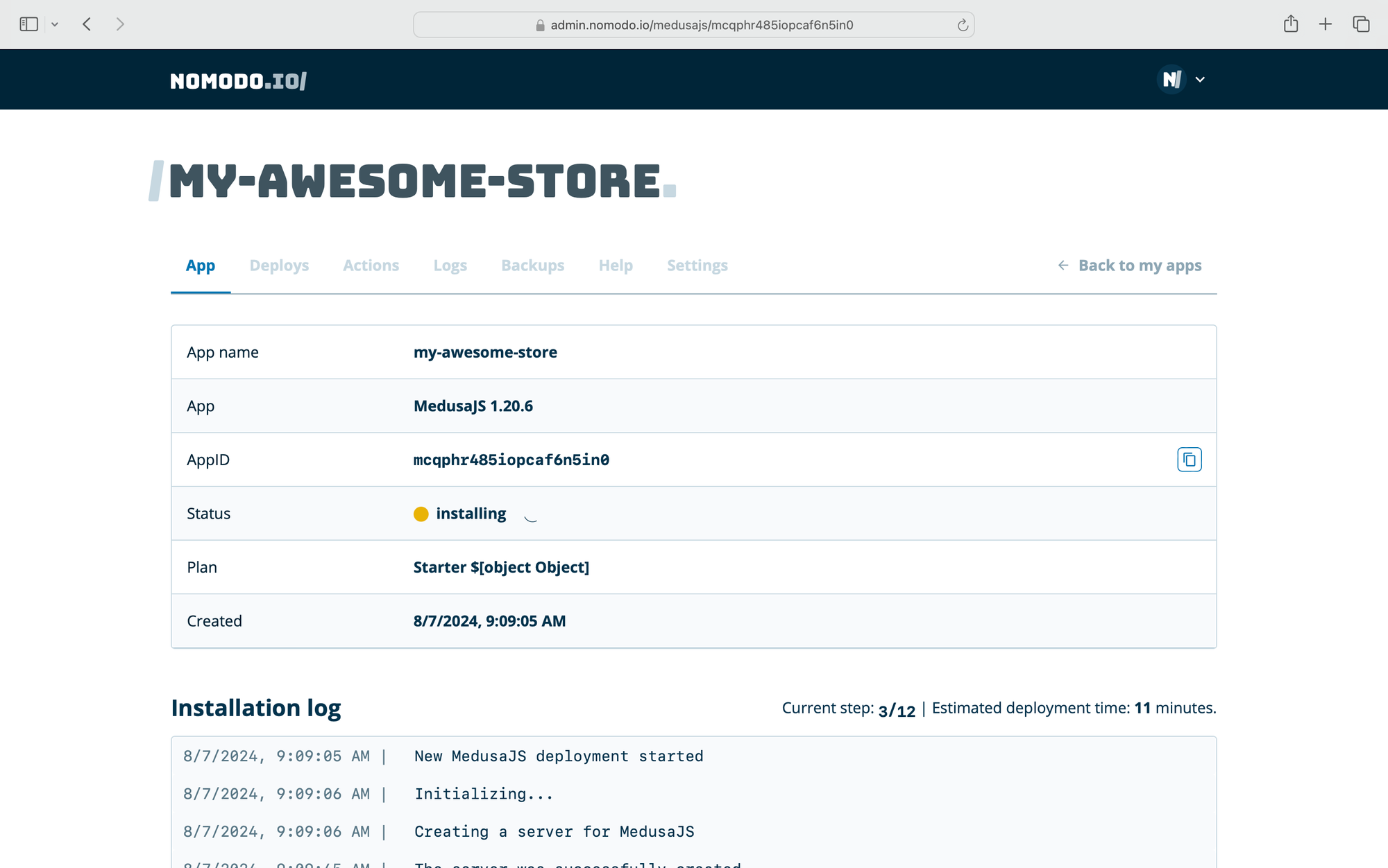 And that's it! The deployment process typically takes about 11 minutes, covering everything from server setup to installing software and configuring your Medusa.js application.
